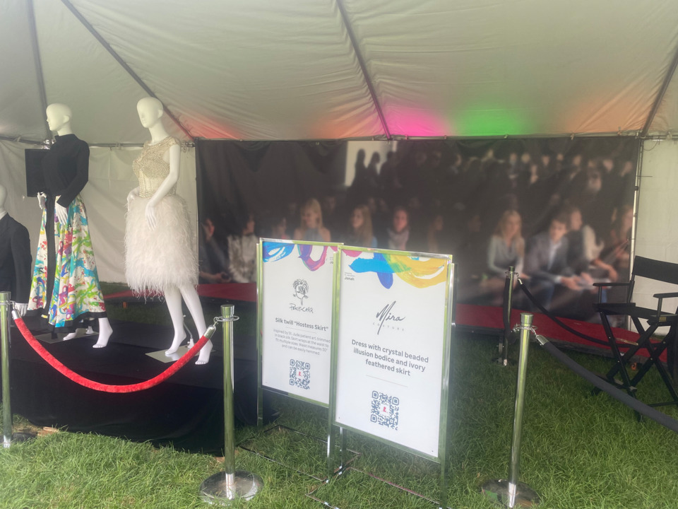 Along with a group of smaller tents, as well as branded flags, banners, signs and other graphics, was one of the most complex elements of the event. An auction wall involved more than 20 boards in a unique configuration that was strung and suspended by fishing line to create a floating illusion.