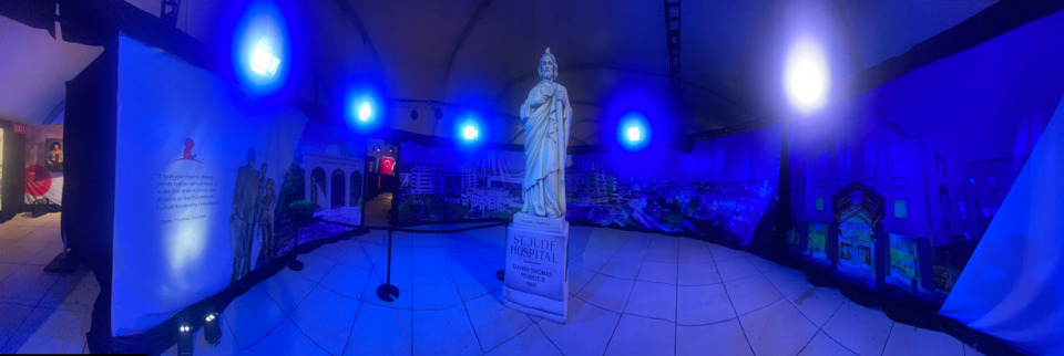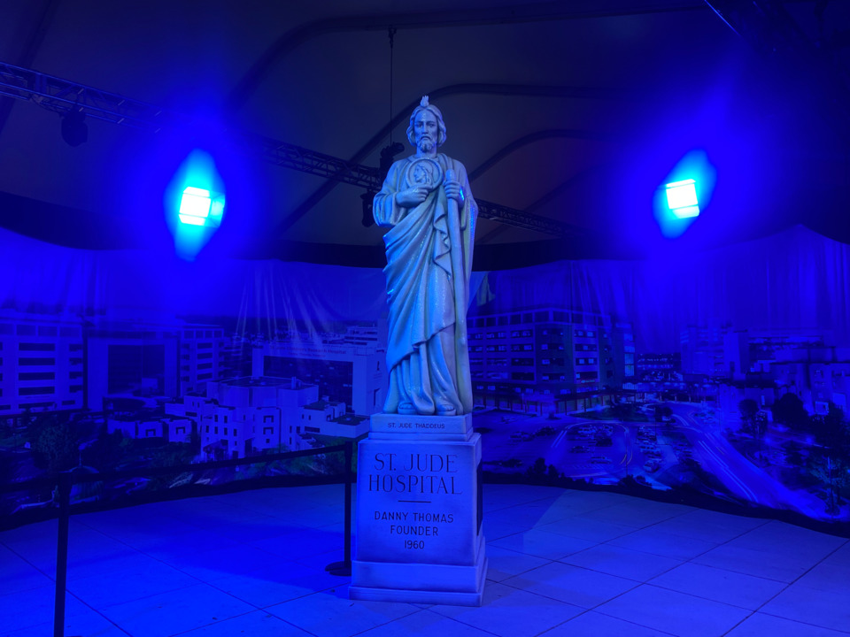 An 82-foot circular rotunda wall designed to make guests feel as though they were on the St. Jude campus had transitional lighting for day and night effects, centered around a replica of the St. Jude Thaddeus statue.