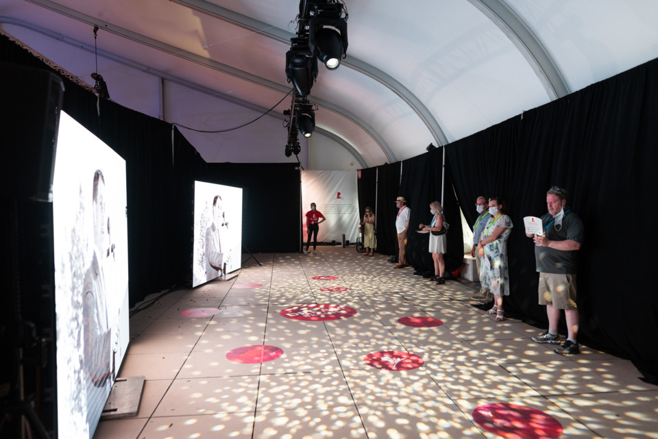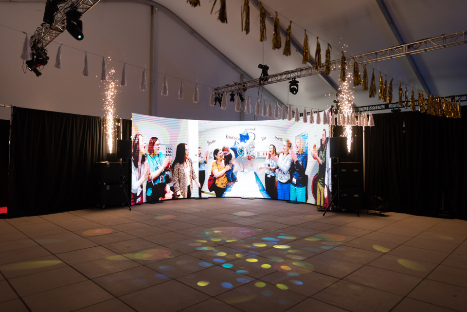 The first was a descending staircase, with a piecemeal graphic wrap on the front of each of the 30 stairs. Together it created the effect of a multi-colored carpet leading into a 100 foot x 100 foot tent, the hub of an immersive St. Jude “Journey” experience. The tent itself was sectioned to create hallways and rooms – telling the story of St. Jude, the vision of founder, Danny Thomas, and the children the hospital is dedicated to helping. The entry room of the tent featured floor graphics, complemented by swirling light projections, adding multiple layers of spectacle to video introductions that played on jumbo screens.