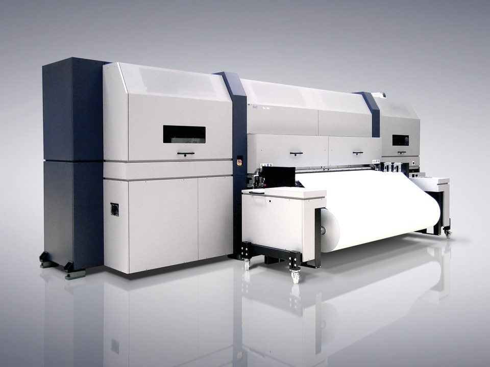 At the centre of the system is the Rho 1000 UV inkjet printer with continuous media transport. It is a high speed, industrial production machine capable of printing up to 500 m² per hour.
