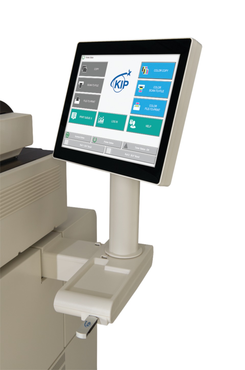 Featuring 2400 x 600 dpi print resolution, 24-Bit color scanning image quality, and fast imaging with KIP Tru•Speed technology, the KIP 70 series was designed to address the demands of high-volume print runs and compressed delivery times without compromising quality. New features include a large 12.1 inch multi-touch control panel that enables high-resolution output previews with zoom, rotate and pan capabilities. In addition, the new KIP Cloud Connect allows users to print from, or scan to, the cloud right from the control panel. This cloud-enabled function allows individual users or groups to create a link to cloud destinations for storage and collaboration, such as Google Drive, Dropbox, SkyDrive and more. The KIP 70 series also features a space saving design that permits next-to-wall installation and an innovative top-stacking configuration.