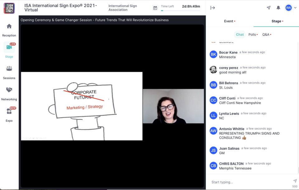ISA President Lori Anderson was the host for the three days, with other ISA representatives chiming in at various times to encourage interaction and participation. The first day kicked off with what is always a much-anticipated feature of in-person Sign Expos, the "Game Changer" session. This session’s topic was “Future Trends That Will Revolutionize Business,” presented by Sheryl Connelly. This was a bird’s-eye view of the global trends that are going to impact businesses regardless of what industry you are in, things like a fast-growing global population, a changing (and aging) population, the potential for resources like food and water to become scarce and other forces. (There was a mention of something called “cricket water” that stimulated a lot of "Mystery Science Theater 3000"-like riffing in the comment feed.) The world and the market are changing in virtually all respects so, advised Connolly, “open your eyes to the endless spectrum of possibilities. The only way to predict the future is to create it.”
