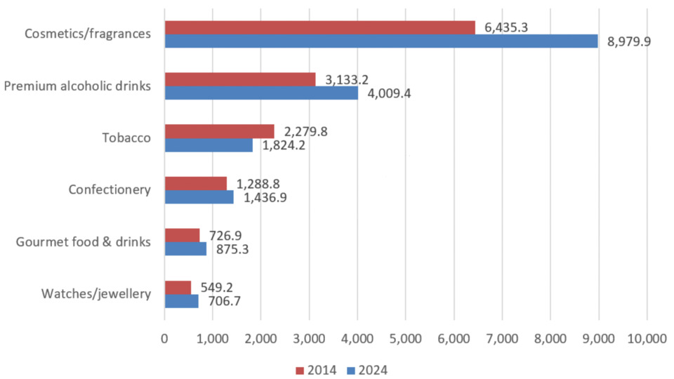 In value terms, the cosmetics and fragrances sector is the market’s largest segment, with sales worth $7.15 billion in 2019 and a market value forecast to average 4.7% in the years leading up to 2024. In 2019, the cosmetics and fragrances sector accounts for a leading 46.5% of global market value. Also noteworthy, the market value for premium alcoholic drinks grew by almost 4% in 2018, but along with the tobacco industry, it is expected to decrease over the next five years.