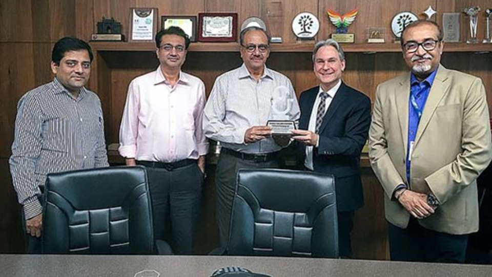 At a ceremony to mark the commissioning of the Rapida 76, Dietmar Heyduck, Koenig & Bauer Sheetfed (2nd from right), honoured Ramesh Kejriwal, Parksons Packaging (centre), as an important partner. Also present: Aditya Surana from Koenig & Bauer sales partner Indo-Polygraph Machinery (left), Siddharth Kejriwal (2nd from left) and Subhasis Roy (right), both Parksons Packaging.