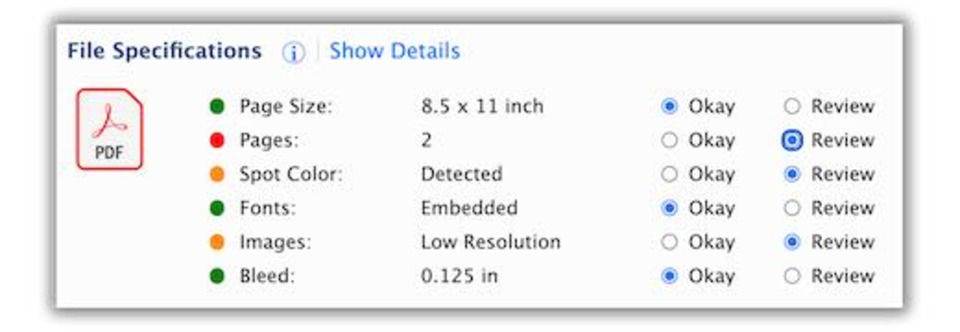 Good2Go print portal addresses these issues automatically with its built-in PDF preflight and print portal job specification summary. At-a-glance, any user can see if there’s a potential issue with these top five issues. This eliminates the need to send most jobs to prepress to be reviewed when it’s built right into the order submission process.