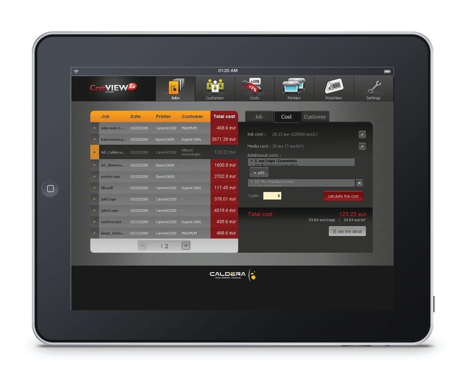 Fully integrated within the Caldera RIP, COSTVIEW 2.0 enables production cost management and monitoring as well as the set-up of a pricing policy. It is a production management solution which extracts information about jobs directly from the RIP spooler, enabling a production manager to control, modify, study and export all costs pertaining to a job.