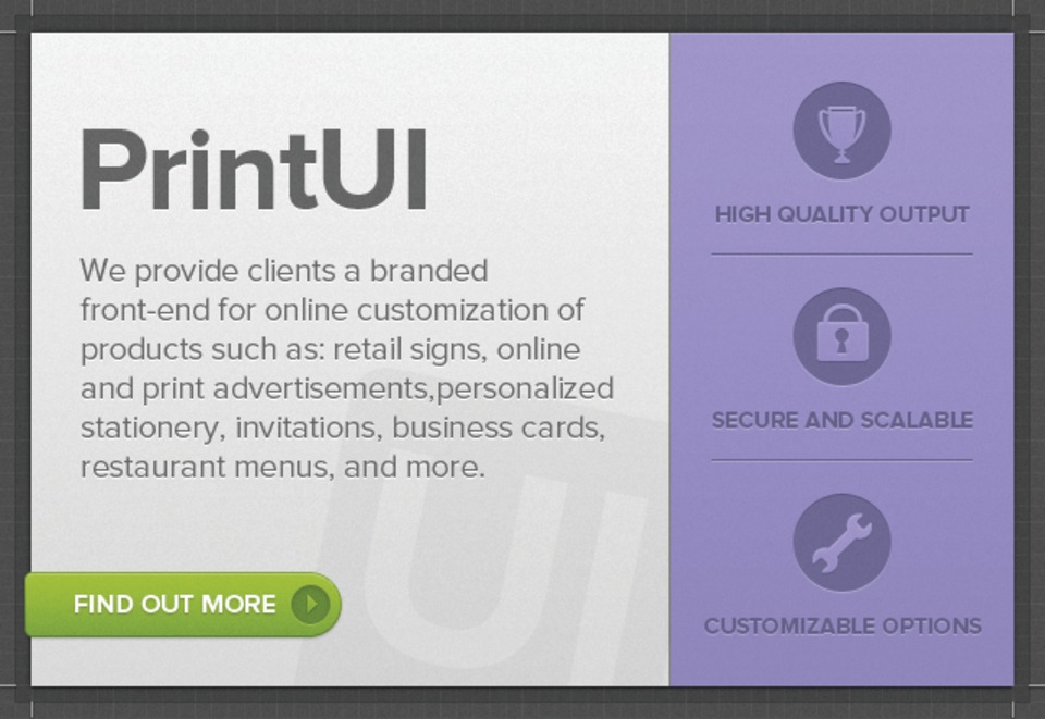 Designed to be used as a standalone Web service or integrated into an existing website, PrintUI provides a unique self-service solutions for printers, their customers and in-house graphics departments responsible for brand management. It’s easy to get started on the PrintUI service: