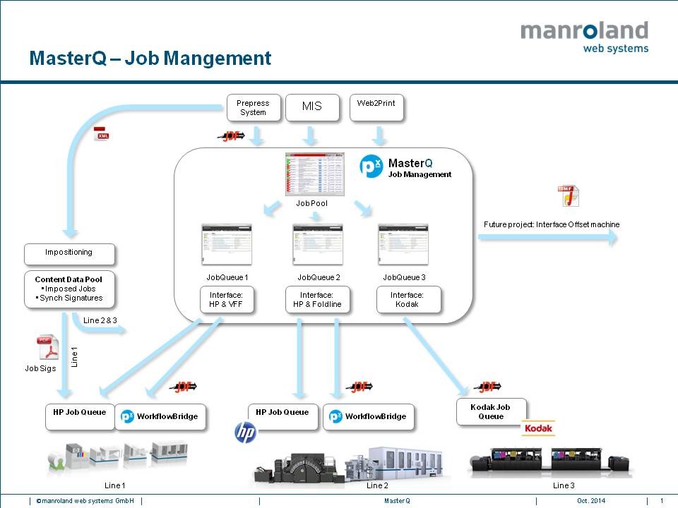 MasterQ was developed by manroland web systems to synchronize finishing modules with the printer and is especially suited for users of one or more digital printing systems and digital finishing lines such as FoldLine and FormerLine. The module sorts, groups, and verifies incoming print orders, even if they stem from various sources, based on a special scalable algorithm. The jobs prepared this way are then relayed to the digital printing systems and the print finishing control (such as WorkflowBridge). In return, these provide MasterQ with status and process information.