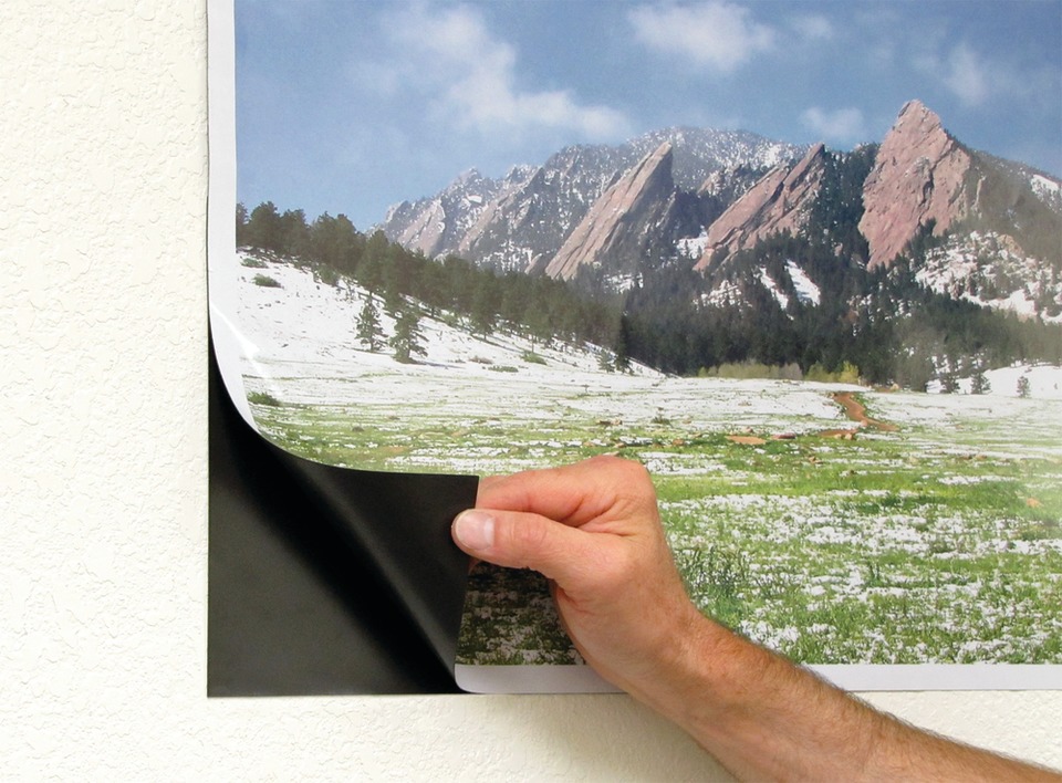 FlexIRON Sheeting is a magnetically receptive material that attracts all types of low profile magnets, including flexible magnetic sheeting and strip, ceramic and neodymium magnets. Both sides of FlexIRON (front and back) attract magnets. It is now available in 48-inch wide rolls. FlexIRON can be used as the base layer for signs, photos and graphics printed on PrintMagnetVinyl, or it can be the top graphic layer (compatible with solvent, eco-solvent, UV and latex ink), using the PrintMagnetVinyl with an adhesive backing as the base.