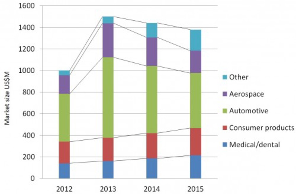 Highest growth will be seen in the medical and dental fields, as well as the jewellery, designer products, and architectural areas, although this will not be monotonic as 3D printing locks into the capital investment cycles of the aerospace and automotive industries, as discussed in the new report from IDTechEx "3D Printing 2013-2025: Technologies, Markets, Players"