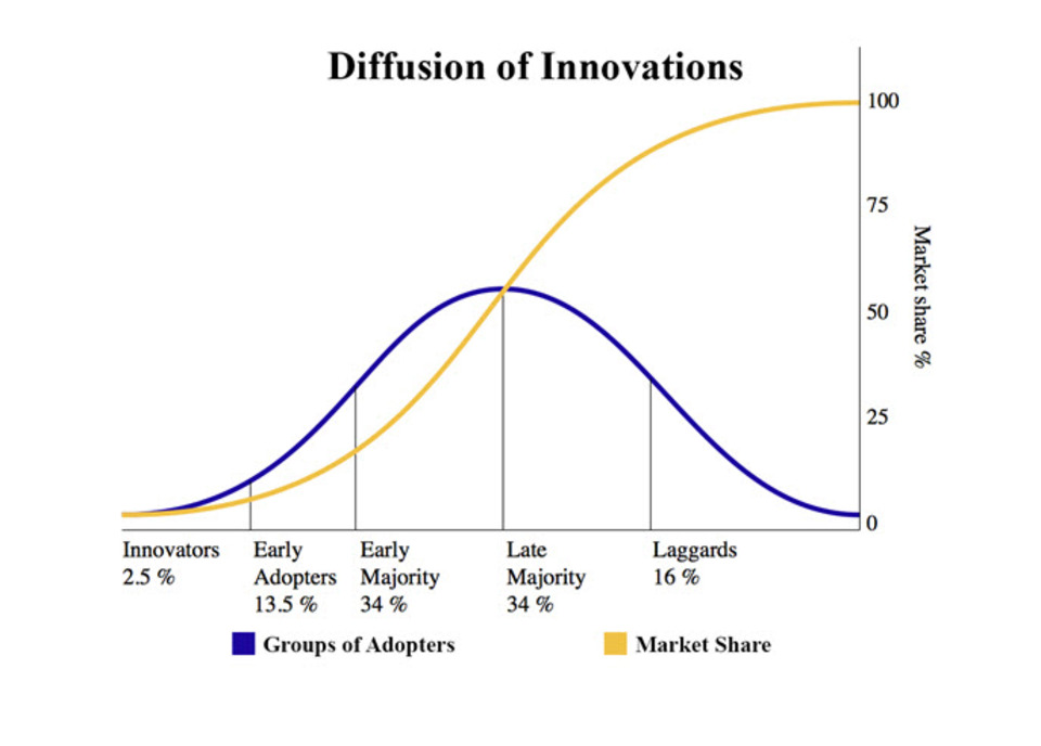 Another way we can look at the impact of readily embracing trends is by learning from a now defunct company that didn’t remain relevant. The “Diffusion of Innovations” is a method to explain how new ideas and new technologies are spread through cultures; diffusion is the process by which an innovation is communicated and adopted over time. On the “Diffusion of Innovation” graphic below, you can see where early adopters get involved in a new technology or product or service. The blue lines are the group of adopters and yellow line is market share. As each threshold is passed, a new group is more likely to adopt. To optimize our success, we need to continue to be on the left side of the adoption curve.